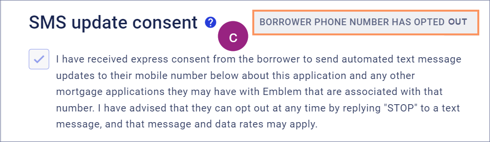c. Once a text recipient opts out, loan teams will see a flag saying Borrower phone number has opted out next to the SMS update consent section header.