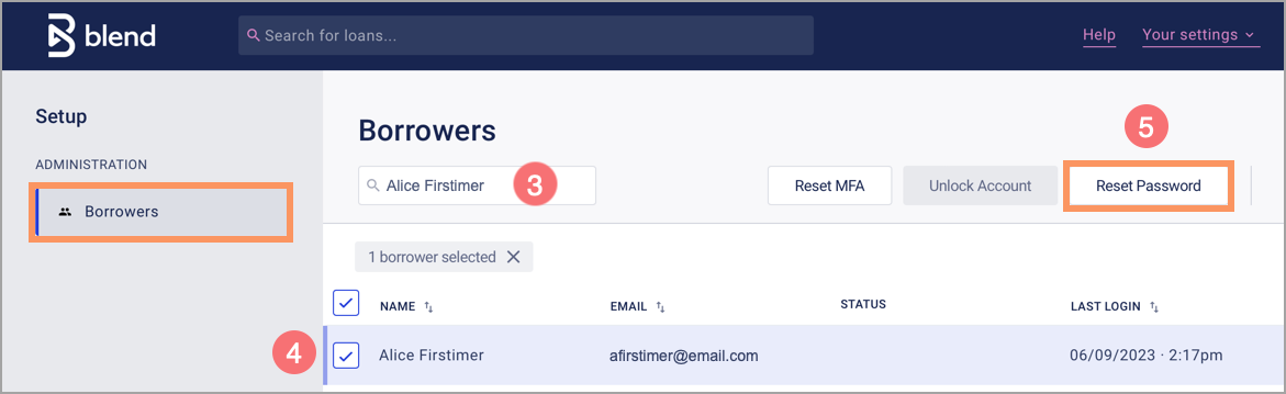 Please note that password reset emails will only be sent to borrowers who have activated their accounts in Blend. Refer to check if the borrower has activated their account to learn more.