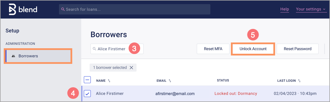 Borrower accounts become dormant if they have not logged in to Blend in over 30 days. There are three ways to unlock a dormant borrower account.