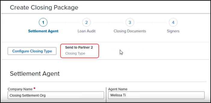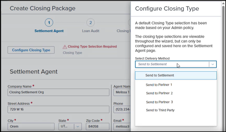 If more than one Partner has been configured to send documents, then the Closing Type field on the Create Closing Package page is left blank, and the user is then required to select the Partner to use. Click the Configure Closing Type button, and then select the Partner from the Select Delivery Method dropdown list.