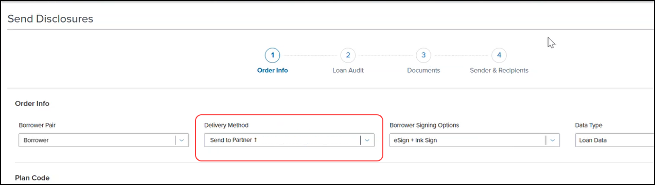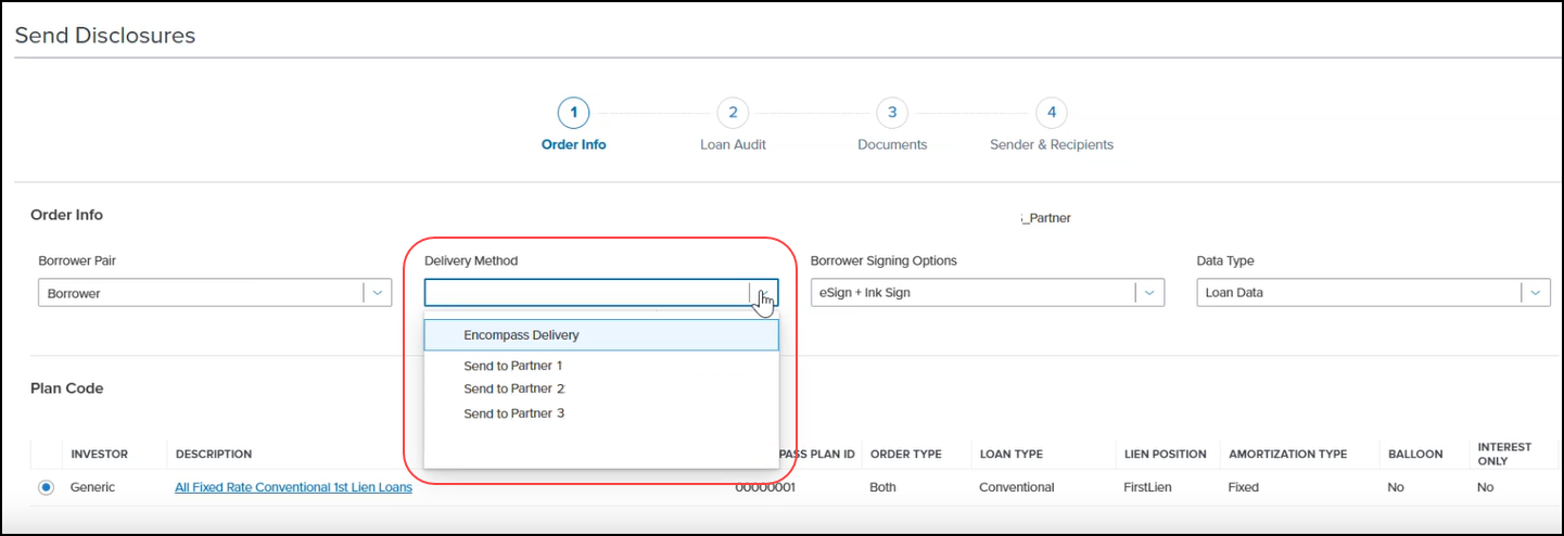 In Encompass instances where more than one Partner has been configured to send documents, then the Delivery Method field on the Send Disclosures page is left blank, and the user is then required to select the Partner to use. They will not be permitted to proceed until a Partner is selected. The same logic applies on the Request/Send Documents and the Pre-Closing Package pages when requesting or sending documents or when sending pre-closing documents. When sending pre-closing closing documents, the audit will not until a Partner (or other) delivery method is selected.