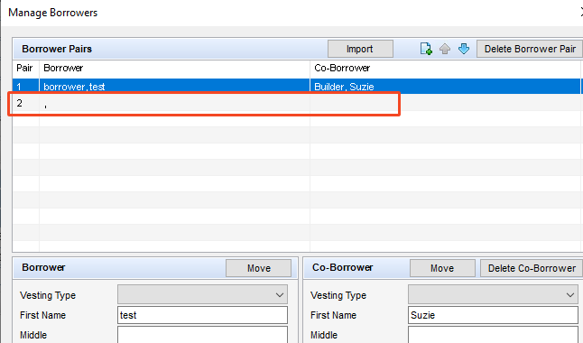 Example: 2 borrowers on 2 separate pairs, in Encompass you move them to be on the same pair causing a ghost pair to remain.